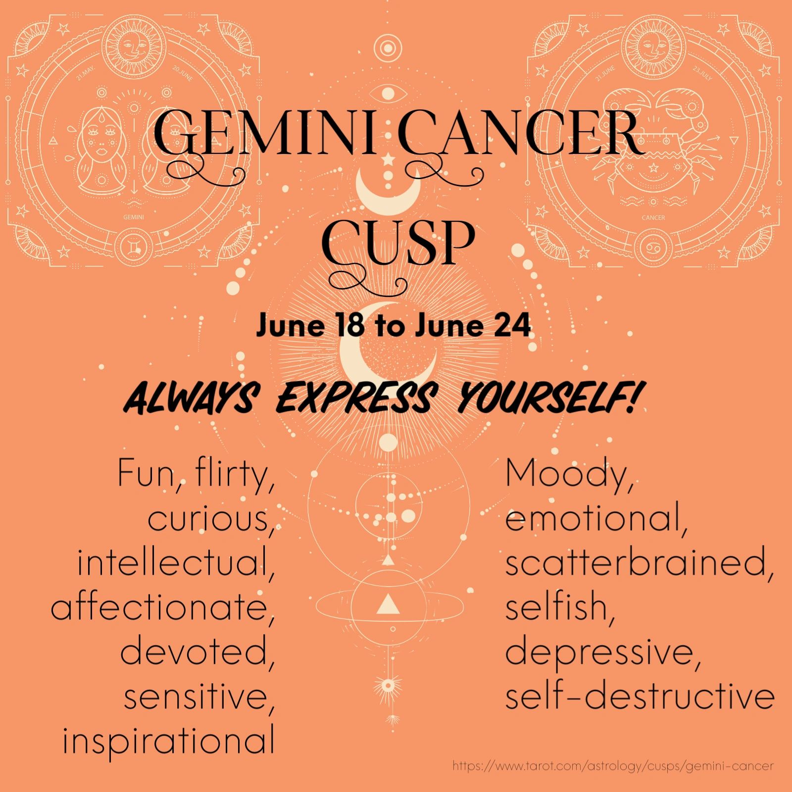 Gemini cancer cusp astrology. Gemini (astrology) - Wikipedia Gemini (♊︎) (/ ˈ dʒ ɛ m ɪ n aɪ / JEM-in-eye, Latin for "twins") is the third astrological sign in the zodiac. Under the tropical zodiac, the sun transits this sign between about May 21 to June 21. Gemini is represented by the twins, Castor and Pollux, known as the Dioscuri in Greek mythology. It is a positive, mutable sign. Gemini Man: Love, Personality Traits & More | Astrology.com Nov 13, 2022 · Gemini dads do this not to be mean or sneaky, but rather to instill a sense of wonder in their kids. Sometimes too easily distractible, the Gemini dad could use the reminder to make lots of quality time for his little ones – giving them his full and undivided attention for playtime that deeply nourishes both parent and child. Cancer and Aquarius Love Compatibility - Astrology.com Cancer is a Water Sign, and Aquarius is an Air Sign. Aquarius sees life as an intellectual exercise, a constant exploration and expansion of the mind. Cancer’s more pragmatic. Cancer stops to ask, ‘how does this feel. ’ while Aquarians keep asking ‘what else is there. Cancer Daily Horoscope | Cafe Astrology .com Nov 17, 2022 · Today's Cancer Horoscope from Cafe Astrology November 17, 2022 Mercury moves into your work and health sector today, dear Cancer, positioning you well for paying attention to details and working through problems.