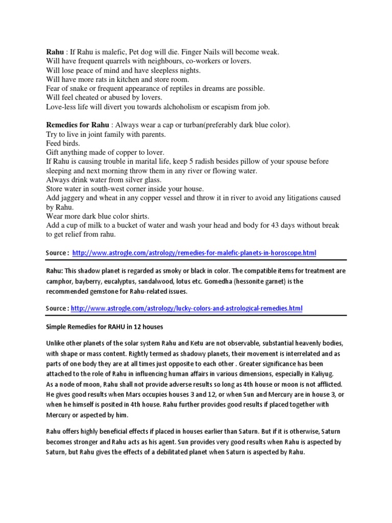 › remedies › planetaryRahu Remedies - How to Strengthen the Planet Rahu in Your ... Dec 12, 2022 · Remedies for Rahu in Vedic Astrology. Rahu indicates irreligious beliefs, adultery, faulty logic, sinful deeds, wickedness, royal status, pilgrimage, foreign residence, old age, poisonous snakes, reptiles, air, space, sudden disaster, difficult terrain and south-west direction. There are certain remedies that can help to pacify an evil Rahu ...